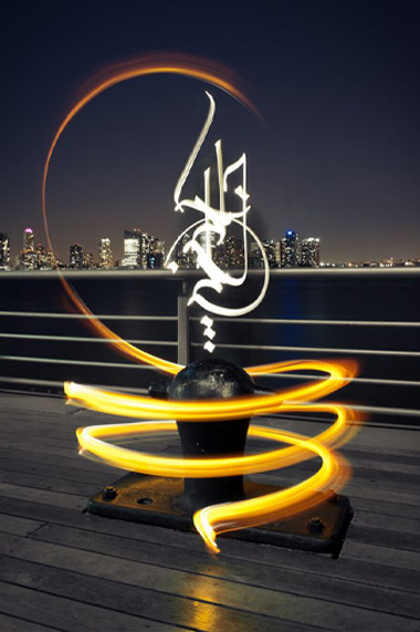 وإن تدخل عنصر التصوير الفوتوغرافي، كمستقطب ضوئي، يمكن عدّه المحمل الثاني للأثر الفني وكعنصر تسجيل وباثّ للتجربة في نتاجها التركيبي الحروفي، وبها تبرز ملامح وهيئة المسار الحركي داخل الفضاء. ومن هذا الإطار تبرز قيمة المواءمة والسجال بين التكوينات الحروفية والفضاء الذي ترتسم فيه، كخطاب وتفاعل ثنائي مباشر، يثير في الوقت نفسه تفصيلات المكان ومكوناته، وكذلك في تموضع التكوينات الحروفية عليه، بتأسيس خطاب بصري محمول بتقنية التصوير الفوتوغرافي وتسجيلات حدوثية الفعل الإنشائي.