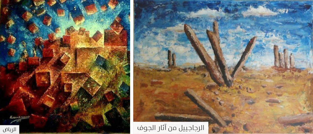 كما تناول مواضيع مأخوذة من البيئة المحلية، وهذه المواضيع تعلق بها وعشقها، حيث نشأت رابطة روحية بينه وبين مكوناتها مثل مسقط رأسه، سكاكا، وما عليها من آثار، مثل: الحصون والقلاع والمآذن والمساجد. كما رسم تراث وعمارة الجوف وسكاكا والرياض وعسير وجدة وسوق دومة الجندل؛ لذلك نلحظ أن الفنان جسد عمارة وتراث وطبيعة بلاده بشمسها الحارة، التي تعد مصدر الألوان والنور الذي ينعكس على الصحراء، وكذلك الطبيعة فيوحي بسيمفونية ألوان لا متناهية، ونلحظ في هذه الأعمال اهتمامه بتأثير الضوء كعامل متغير على الأشكال، فنجد الضوء الساقط على عناصر لوحاته يحيلها إلى مجموعات لونية متناغمة، فالأرض والسماء والقلاع والحصون (بأبوابها القديمة) تضم مجموعتين من الألوان (الباردة) و(الحارة)، فنجد الأصفر والبني والأزرق والبنفسجي والبرتقالي… ويظهر ذلك على مسطحات لوحاته التي تزخر بالألوان المتضادة والمتناغمة.