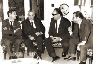 مع كمال جنبلاط ونقولا شاوي الأمين العام للحزب الشيوعي اللبناني وفاروق معصراني عضو المكتب السياسي للحزب