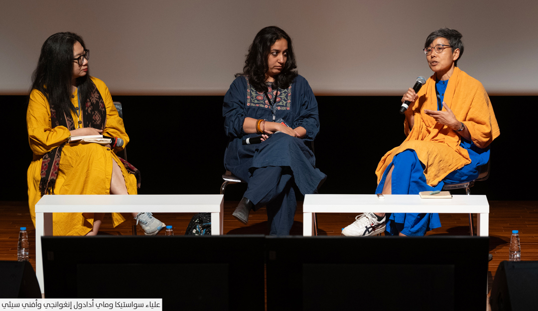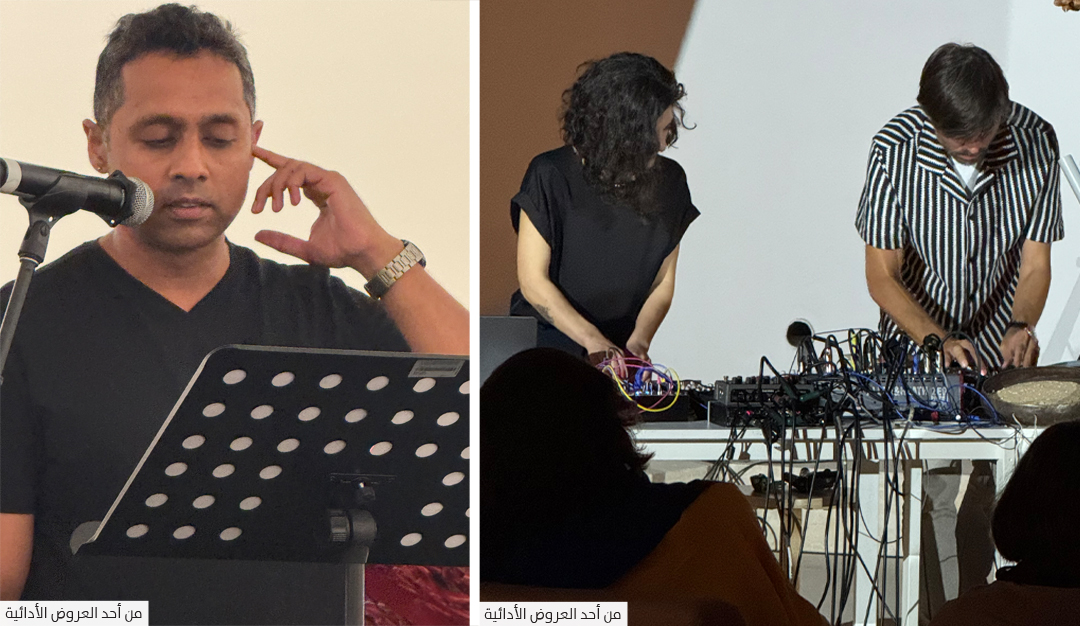 أما القيّمة أمل خلف فترى أن المد والجزر في الخليج العربي، الذي يتصل بالمحيط الهندي عبر ساحل إمارة الشارقة، يتجسد كحلقة تربط أجسادنا بأجساد مائية أخرى. «وبدورها، تربطنا هذه المياه بعوالم وحيوات تعيش تحت وطأة أزمات مستمرة، وخسارات متراكمة، وانهيارات بيئية متجذرة في قرون من الأنظمة الاستعمارية والعسكرية المستنزفة. ومع تداعي الزمن، تصبح أجسادنا نقطة التقاء، مستودعًا للذكاء الجمعي والحزن المشترك. وعند هذا التلاقي بين اليابسة والماء، لطالما حملت النساء عبء الرعاية، حيث كنّ يعتنين بالحزن ويرافقن الآخرين في مسارات التغير. إن طقوس الشفاء والحماية، والعرافة، وممارسات الحداد تشبه عمل القابلة التي تسهّل ميلاد حياة جديدة، وتيسّر الانتقال من حياة إلى أخرى، وتحمل عبء الرعاية المجتمعية. هذه الطقوس متجذرة في الجسد، ومُسجلَّة في ذاكرته، فتعمل على شفاء الإحساس بالخسارة الذي يمتد إلى ما يتجاوز حدود الذاكرة الحية».