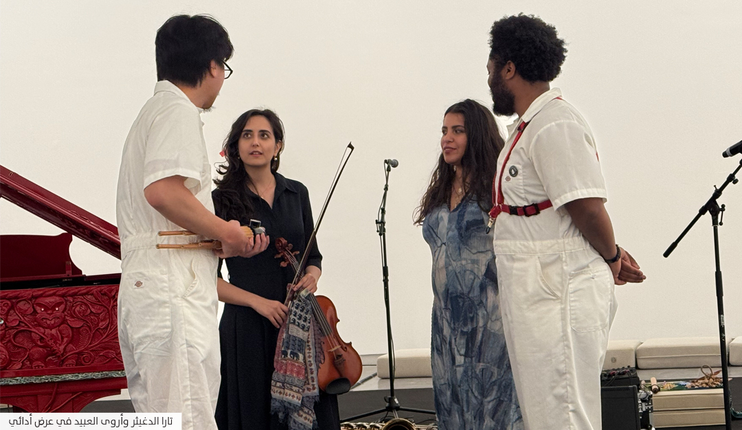 من عروض الأداء اللافتة التي لاقت استحسان الحضور، عرض «التقاء الأنهار في سلم «مي» الموسيقي الصغير: وشارك فيه: تارا الدغيثر وزياري ترينيداد شيرمان وشاتوري شيميزو وأروى العبيد. ويأتي هذا العرض امتدادًا لعرض سابق لتارا الدغيثر قدمته، في بينالي الشارقة 16، وهو عبارة عن نوتة موسيقية تصويرية تقود استكشافًا صوتيًّا عبر الارتجال. ويتجذر العمل في الأساطير السومرية وتتجلى على شكل ثلاث حركات هي التدفق الصوتي، والاتحاد المقدس والأصداء الأدبية. تستوحي المقطوعة من التقاء البر بالبحر في جزيرة بوبيان في شط العرب، وتتبع حركة نهري دجلة والفرات والخليج العربي، مستخدمة الصوت مجازًا عن الوعي المشوش، حيث يتنقل العازفون بين مشاهد صوتية متغيرة، تتوج بلحظة اتحاد تعكس تاريخًا عميقًا من الترابط والانقسام في المنطقة.