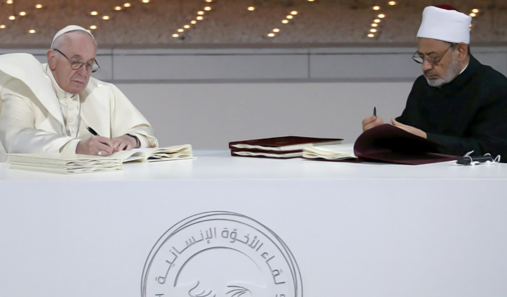 أسس اللقاء بين البابا فرنسيس (Francis) (2013-)، رأس الكنيسة الكاثوليكية، وشيخ الأزهر الإمام أحمد الطيب، الذي حدث خلال ثلاثة أيام (3-5 فبراير/ شباط 2019م) في الإمارات العربية المتحدة، بدعوة بادر إليها الشيخ محمد بن زايد ولي عهد أبوظبي، لتاريخ جديد في العلاقات الإسلامية– المسيحية، وفتح آفاقًا للتلاقي بينهما، كُلِّلت بالتوقيع على «وثيقة الأخوة الإنسانية من أجل السلام العالمي والعيش المشترك»(5)، التي قارنها بعضٌ بالإعلان العالمي لحقوق الإنسان؛ «لكنها هنا قائمة على القيم الدينية والأخلاقية مثل الرحمة والمحبة والإنصاف وقبول الآخر ومعاملة البر والقسط، وتقصُّد السلام والأخوة بكل سبيل»(6).